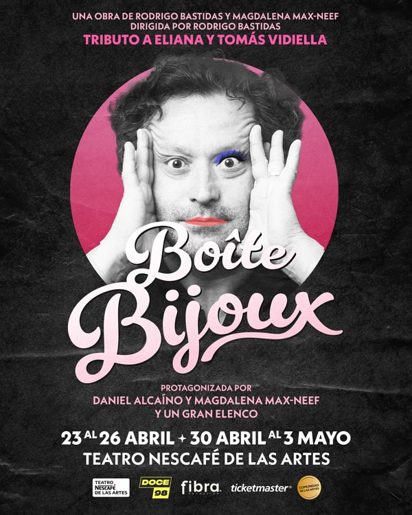 “Boîte Bijoux” será protagonizada por el destacado actor Daniel Alcaíno, quien encarnará a Tomás Vidiella, mientras que Magdalena Max-Neef personificará a Eliana (compañera inseparable de sus aventuras teatrales), para repasar aspectos fundamentales de sus vidas: la profunda relación entre ambos, sus vínculos con el teatro, así como la creación de aquel montaje que marcó un hito artístico en Chile (con última temporada en 2019).